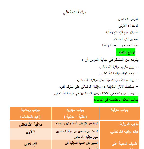 دليل المعلم لمادة التربية الاسلامية وحدة مراقبة الله تعالى للصف